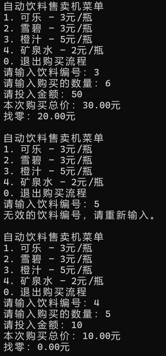#include <stdio.h> int main() { int choice, quantity; float total_price = 0, amount_paid, change; while (1) { printf("\n自动饮料售卖机菜单\n"); printf("1. 可乐 - 3元/瓶\n"); printf("2. 雪碧 - 3元/瓶\n"); printf("3. 橙汁 - 5元/瓶\n"); printf("4. 矿泉水 - 2元/瓶\n"); printf("0. 退出购买流程\n"); printf("请输入饮料编号:"); scanf_s("%d", &choice); if (choice == 0) break; if (choice < 1 or choice>4) { printf("无效的饮料编号,请重新输入。\n"); continue; } printf("请输入购买的数量:"); scanf_s("%d", &quantity); if (quantity < 0) { printf("购买数量不能为负数,请重新输入。\n"); continue; } switch (choice) { case 1: case 2: total_price += 3 * quantity; break; case 3: total_price += 5 * quantity; break; case 4: total_price += 2 * quantity; break; } printf("请投入金额:"); scanf_s("%f", &amount_paid); change = amount_paid - total_price; printf("本次购买总价:%.2f元\n", total_price); printf("找零:%.2f元\n", change); total_price = 0; } printf("感想您的购买,欢迎下次光临!\n"); return 0; }