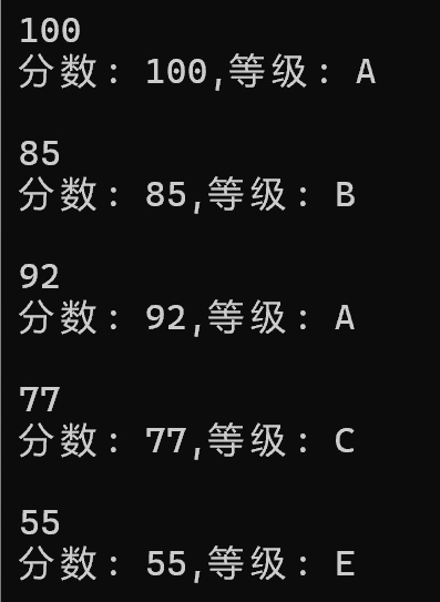 #include<stdio.h> char score_to_grade(int score); int main() { int score; char grade; while (scanf_s("%d", &score) != EOF) { grade = score_to_grade(score); printf("分数: %d,等级: %c\n\n", score, grade); } return 0; } char score_to_grade(int score) { char ans; switch (score / 10) { case 10: case 9:ans = 'A'; break; case 8:ans = 'B'; break; case 7:ans = 'C'; break; case 6:ans = 'D'; break; default:ans = 'E'; } return ans; }