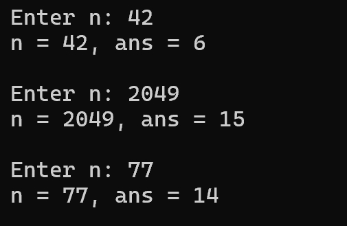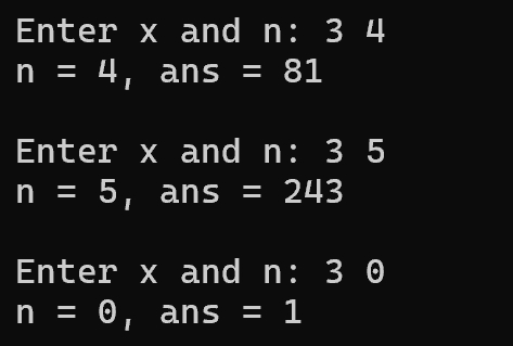 #include <stdio.h> int power(int x, int n); int main() { int x, n; int ans; while (printf("Enter x and n: "), scanf_s("%d%d", &x, &n) != EOF) { ans = power(x, n); printf("n = %d, ans = %d\n\n", n, ans); } return 0; } int power(int x, int n) { int t; if (n == 0) return 1; else if (n % 2) return x * power(x, n - 1); else { t = power(x, n / 2); return t * t; } }