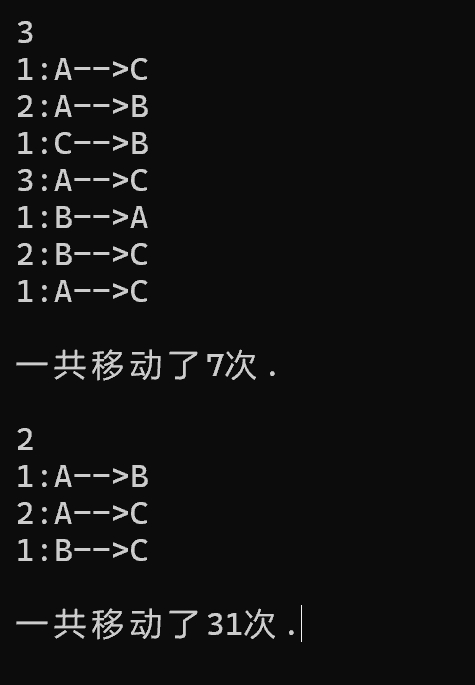 #include<stdio.h> #include<stdlib.h> void hanoi(unsigned int n, char from, char temp, char to); void moveplate(unsigned int n, char from, char to); int main() { unsigned int n,i; int count = 0; int j=1; while (scanf_s("%u", &n) != EOF) { hanoi(n, 'A', 'B', 'C'); for (i = 0; i < n; ++i) { j *= 2; } count = j - 1; printf(" \n"); printf("一共移动了%d次.", count); count = 0; } return 0; } void hanoi(unsigned int n, char from, char temp, char to) { if (n == 1) moveplate(n, from, to); else { hanoi(n - 1, from, to, temp); moveplate(n, from, to); hanoi(n - 1, temp, from, to); } } void moveplate(unsigned int n, char from, char to) { printf("%u:%c-->%c\n", n, from, to); }