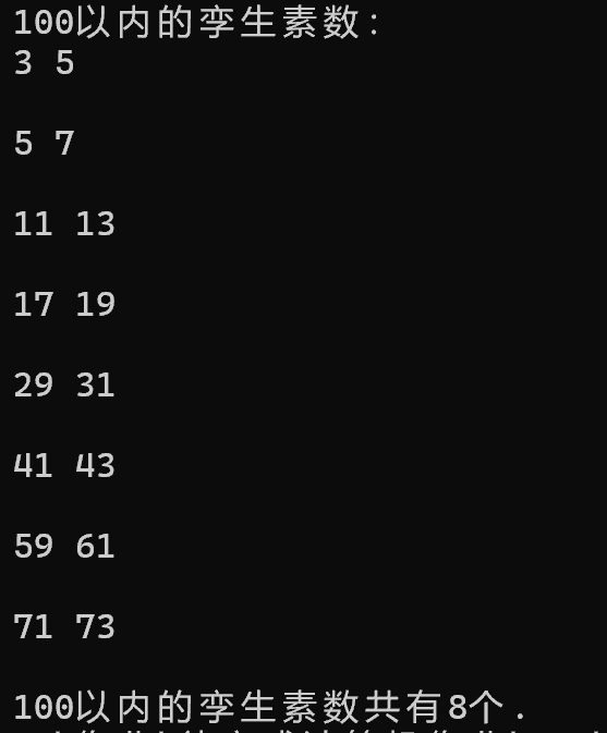 #include<stdio.h> int is_prime(int n); int main() { int n=1; int count=0; printf("100以内的孪生素数:\n"); while (n <= 100) { if (is_prime(n)==1 and is_prime(n+2)==1) { printf("%d %d\n\n", n, n + 2); count += 1; } n += 1; } printf("100以内的孪生素数共有%d个.", count); return 0; } int is_prime(int n) { int i; for (i = 2; i < n; i++) { if (n % i == 0) break; } if (i==n) return 1; else return 0; }