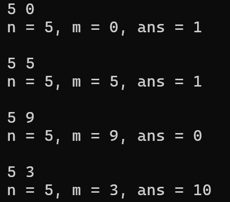 #include <stdio.h> int func(int n, int m); int main() { int n, m; int ans; while (scanf_s("%d%d", &n, &m) != EOF) { ans = func(n, m); printf("n = %d, m = %d, ans = %d\n\n", n, m, ans); } return 0; } int func(int n, int m) { int up=n, down=m; int c=0; if (m == 0 || m == n) return 1; while ((m > 1)and (n > m - 1)) { --n, --m; up *= n; down *= m; } if(down>0) c = up / down; return c; }