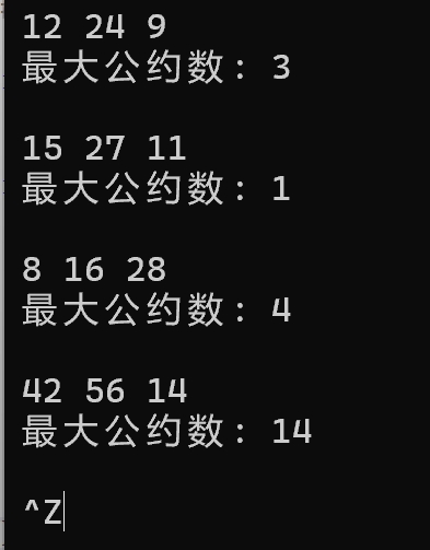 #include <stdio.h> int gcd(int a, int b, int c); int main() { int a, b, c; int ans; while (scanf_s("%d%d%d", &a, &b, &c) != EOF) { ans = gcd(a, b, c); printf("最大公约数: %d\n\n", ans); } return 0; } int gcd(int a,int b,int c) { while (a != b) { if (a > b) a = a - b; else b = b - a; } while (c != b) { if (c > b) c = c - b; else b = b - c; } while (a != c) { if (a > c) a = a - c; else c = c - a; } return a; }