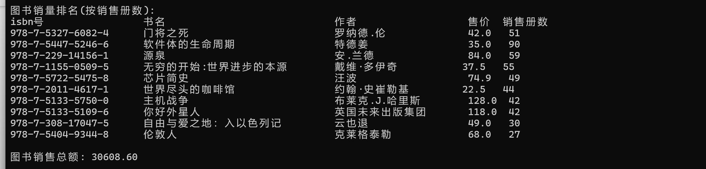 #define _CRT_SECURE_NO_WARNINGS 1 #include <stdio.h> #include <string.h> #define N 10 typedef struct { char isbn[20]; // isbn号 char name[80]; // 书名 char author[80]; // 作者 double sales_price; // 售价 int sales_count; // 销售册数 } Book; void output(Book x[], int n); void sort(Book x[], int n); double sales_amount(Book x[], int n); int main() { Book x[N] = { {"978-7-5327-6082-4", "门将之死", "罗纳德.伦", 42, 51}, {"978-7-308-17047-5", "自由与爱之地:入以色列记", "云也退", 49 , 30}, {"978-7-5404-9344-8", "伦敦人", "克莱格泰勒", 68, 27}, {"978-7-5447-5246-6", "软件体的生命周期", "特德姜", 35, 90}, {"978-7-5722-5475-8", "芯片简史", "汪波", 74.9, 49}, {"978-7-5133-5750-0", "主机战争", "布莱克.J.哈里斯", 128, 42}, {"978-7-2011-4617-1", "世界尽头的咖啡馆", "约翰·史崔勒基", 22.5, 44}, {"978-7-5133-5109-6", "你好外星人", "英国未来出版集团", 118, 42}, {"978-7-1155-0509-5", "无穷的开始:世界进步的本源", "戴维·多伊奇", 37.5, 55}, {"978-7-229-14156-1", "源泉", "安.兰德", 84, 59} }; printf("图书销量排名(按销售册数): \n"); sort(x, N); output(x, N); printf("\n图书销售总额: %.2f\n", sales_amount(x, N)); return 0; } // 待补足:函数output()实现 void output(Book x[], int n) { int i; printf("isbn号 书名 作者 售价 销售册数\n"); for (i = 0; i < n; i++) printf("%-20s %-30s %-20s %-5.1f %d\n", x[i].isbn, x[i].name, x[i].author, x[i].sales_price, x[i].sales_count); } // 待补足:函数sort()实现 void sort(Book x[], int n) { Book temp; for (int i = 0; i < n - 1; i++) { for (int j = 1; j < n - i - 1; j++) { if (x[j].sales_count <x[j+1].sales_count) { temp = x[j]; x[j] = x[j + 1]; x[j + 1] = temp; } } } } // 待补足:函数sales_count()实现 double sales_amount(Book x[], int n) { int i; double amount = 0; for (i = 0; i < n; ++i) amount += x[i].sales_count * x[i].sales_price; return amount; }