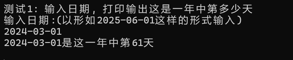 #include <stdio.h> typedef struct { int year; int month; int day; } Date; // 函数声明 void input(Date* pd); // 输入日期给pd指向的Date变量 int day_of_year(Date d); // 返回日期d是这一年的第多少天 int compare_dates(Date d1, Date d2); // 比较两个日期: // 如果d1在d2之前,返回-1; // 如果d1在d2之后,返回1 // 如果d1和d2相同,返回0 void test1() { Date d; int i; printf("输入日期:(以形如2025-06-01这样的形式输入)\n"); for (i = 0; i < 3; ++i) { input(&d); printf("%d-%02d-%02d是这一年中第%d天\n\n", d.year, d.month, d.day, day_of_year(d)); } } void test2() { Date Alice_birth, Bob_birth; int i; int ans; printf("输入Alice和Bob出生日期:(以形如2025-06-01这样的形式输入)\n"); for (i = 0; i < 3; ++i) { input(&Alice_birth); input(&Bob_birth); ans = compare_dates(Alice_birth, Bob_birth); if (ans == 0) printf("Alice和Bob一样大\n\n"); else if (ans == -1) printf("Alice比Bob大\n\n"); else printf("Alice比Bob小\n\n"); } } int main() { printf("测试1: 输入日期, 打印输出这是一年中第多少天\n"); test1(); printf("\n测试2: 两个人年龄大小关系\n"); test2(); } // 补足函数input实现 // 功能: 输入日期给pd指向的Date变量 void input(Date* pd) { scanf_s("%d-%d-%d", &pd->year, &pd->month, &pd->day); } // 补足函数day_of_year实现 // 功能:返回日期d是这一年的第多少天 int day_of_year(Date d) { int days_in_month[] = { 31, 28, 31, 30, 31, 30, 31, 31, 30, 31, 30, 31 }; int sum = 0; for (int i = 0; i < d.month - 1; i++) { if (i == 1) { if ((d.year % 4 == 0 && d.year % 100 != 0) || (d.year % 400 == 0)) { days_in_month[i] = 29; sum += days_in_month[i]; } } else { sum += days_in_month[i]; } } sum += d.day; return sum; } // 补足函数compare_dates实现 // 功能:比较两个日期: // 如果d1在d2之前,返回-1; // 如果d1在d2之后,返回1 // 如果d1和d2相同,返回0 int compare_dates(Date d1, Date d2) { if (d1.year < d2.year) return -1; else if (d1.year > d2.year) return 1; else { if (d1.month < d2.month) return -1; else if (d1.month > d2.month) return 1; else { if (d1.day < d2.day) return -1; else if (d1.day > d2.day) return 1; else return 0; } } }