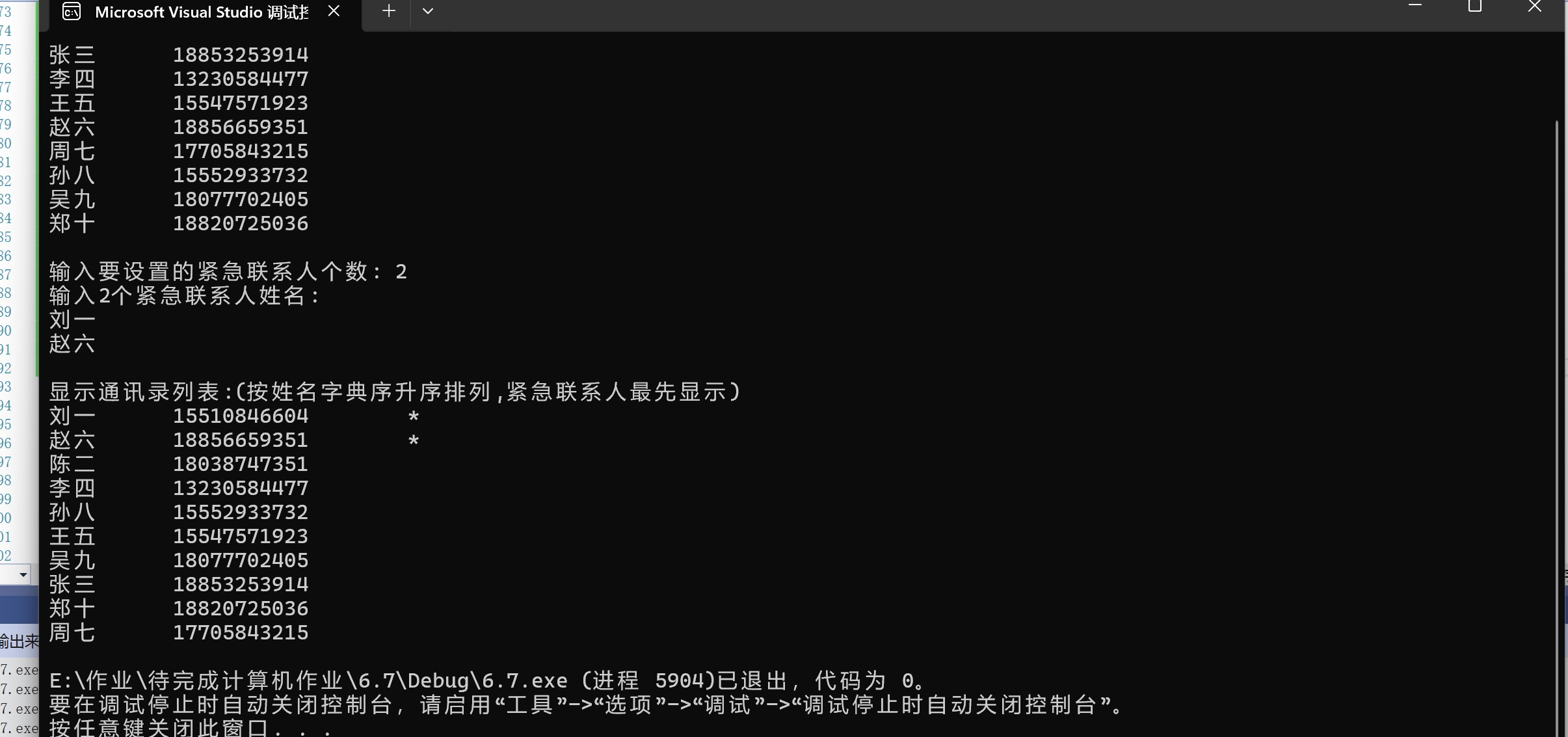 #define _CRT_SECURE_NO_WARNINGS 1 #include <stdio.h> #include <string.h> typedef struct { char name[20]; // 姓名 char phone[12]; // 手机号 int vip; // 是否为紧急联系人,是取1;否则取0 } Contact; // 函数声明 void set_vip_contact(Contact x[], int n, char name[]); // 设置紧急联系人 void output(Contact x[], int n); // 输出x中联系人信息 void display(Contact x[], int n); // 按联系人姓名字典序升序显示信息,紧急联系人最先显示 #define N 10 int main() { Contact list[N] = { {"刘一", "15510846604", 0}, {"陈二", "18038747351", 0}, {"张三", "18853253914", 0}, {"李四", "13230584477", 0}, {"王五", "15547571923", 0}, {"赵六", "18856659351", 0}, {"周七", "17705843215", 0}, {"孙八", "15552933732", 0}, {"吴九", "18077702405", 0}, {"郑十", "18820725036", 0} }; int vip_cnt, i; char name[20]; printf("显示原始通讯录信息: \n"); output(list, N); printf("\n输入要设置的紧急联系人个数: "); scanf_s("%d", &vip_cnt); printf("输入%d个紧急联系人姓名:\n", vip_cnt); for (i = 0; i < vip_cnt; ++i) { scanf("%s", &name); set_vip_contact(list, N, name); } printf("\n显示通讯录列表:(按姓名字典序升序排列,紧急联系人最先显示)\n"); display(list, N); return 0; } // 补足函数set_vip_contact实现 // 功能:将联系人数组x中,联系人姓名与name一样的人,设置为紧急联系人(即成员vip值设为1) void set_vip_contact(Contact x[], int n, char name[]) { int i,j; for (i = 0; i < n; ++i) { for (j = 0; j < N; ++j) { if (strcmp(x[i].name, name) == 0) x[i].vip = 1; } } } // 补足函数display实现 // 功能: 显示联系人数组x中的联系人信息 // 按姓名字典序升序显示, 紧急联系人显示在最前面 void display(Contact x[], int n) { int i,j; Contact temp; for ( i = 0; i < n - 1; i++) { for ( j = 0; j < n - i - 1; j++) { Contact* a = &x[j]; Contact* b = &x[j + 1]; if (a->vip < b->vip) { Contact temp = *a; *a = *b; *b = temp; } else if (a->vip == b->vip) { if (strcmp(a->name, b->name) > 0) { Contact temp = *a; *a = *b; *b = temp; } } } } output(x, n); } void output(Contact x[], int n) { int i; for (i = 0; i < n; ++i) { printf("%-10s%-15s", x[i].name, x[i].phone); if (x[i].vip) printf("%5s", "*"); printf("\n"); } }