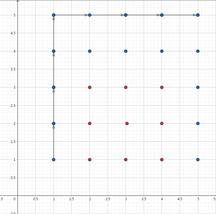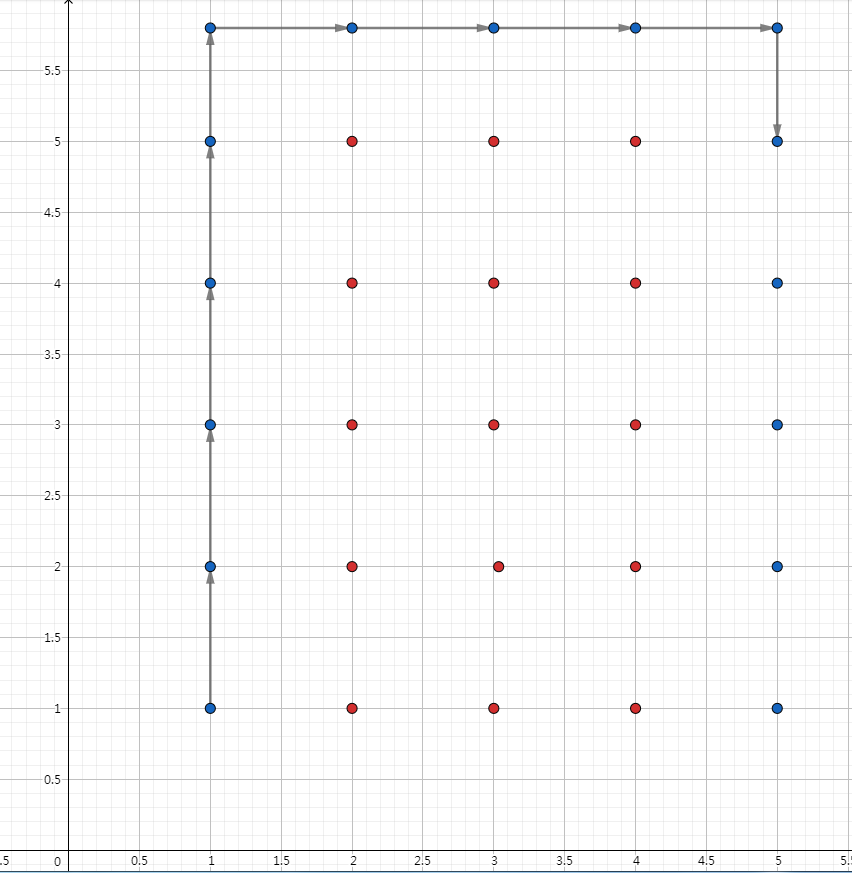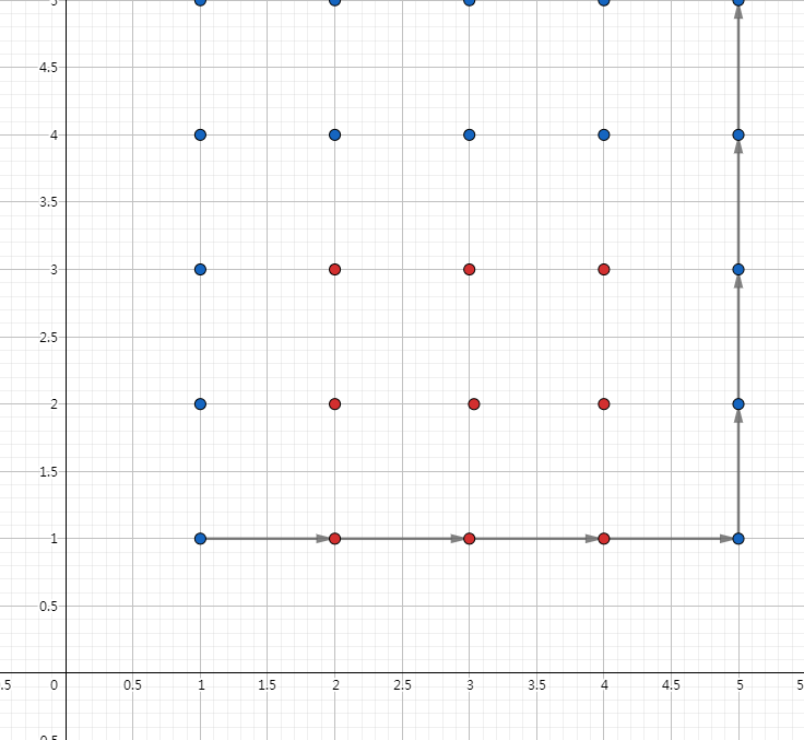 也就是说,先向上再向右的 \(\texttt{B}\) 类点数量 \(\le\) 先向右再向上的 \(\texttt{B}\) 类点数量。换言之,使用第一种方法一定比使用第二种方法更优秀。