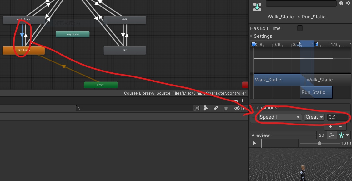 上图表示,在walk-static到run-static中,只有满足速度高于0.5才可以;如果出现,人物进入游戏后,只跑动一下,就停止了,这有可能是速度设定的原因,当速度小于0.5时,就不会跑了,可以在movement状态下将speed_f这个参数改成1.0;