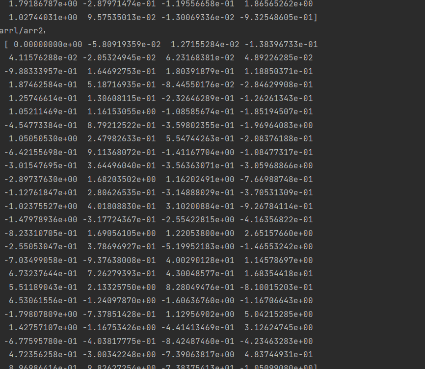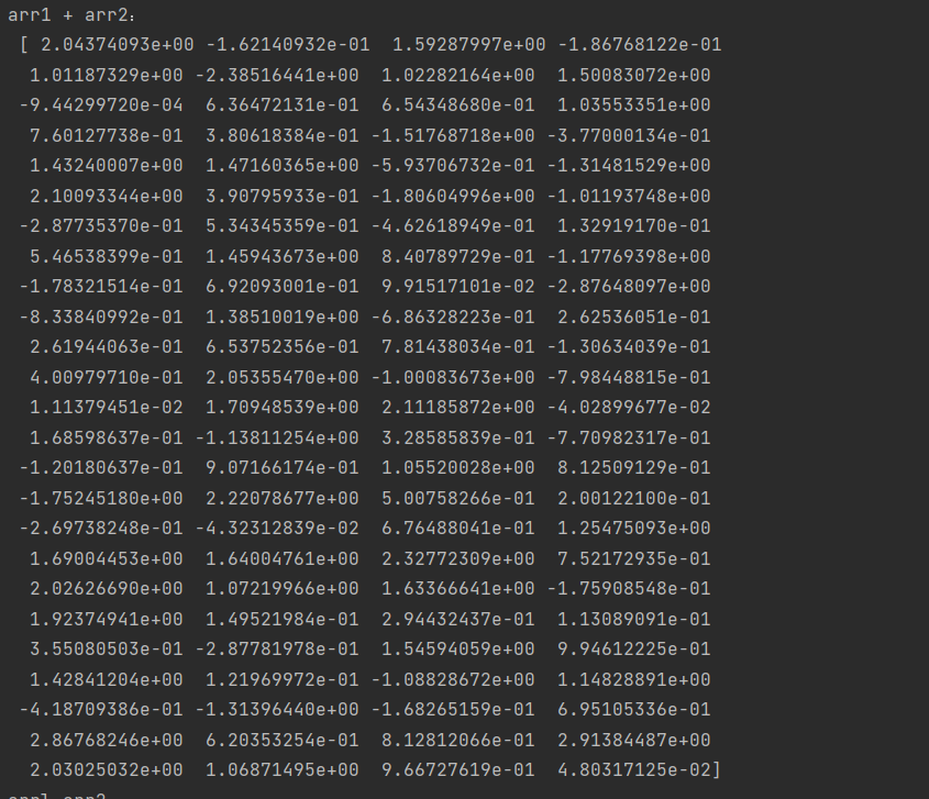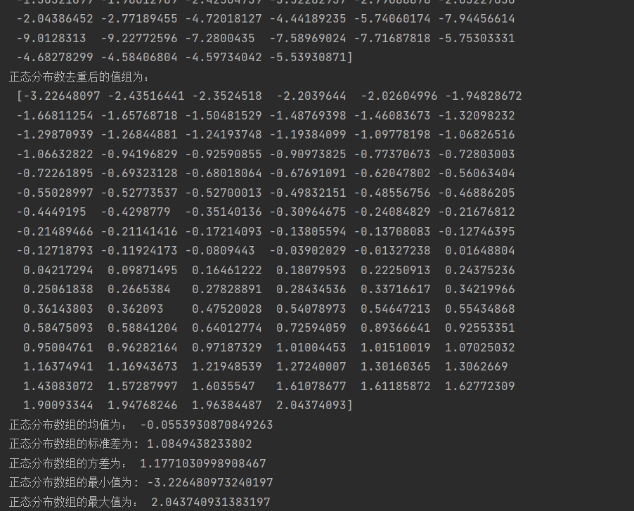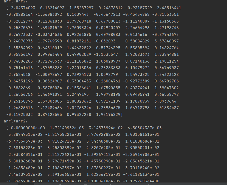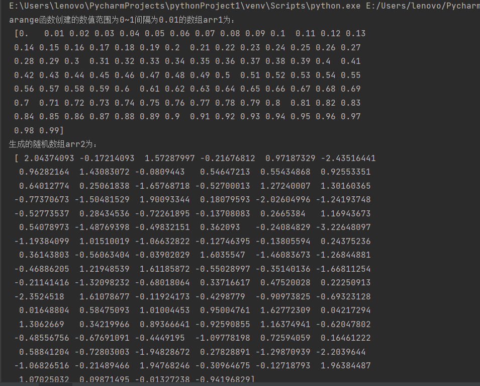 1 import numpy as np 2 #1、创建一个数值范围为0~1,间隔为0.01的数组 3 arr1=np.arange(0,1,0.01) 4 print("arange函数创建的数值范围为0~1间隔为0.01的数组arr1为:\n",arr1) 5 #2、创建由100个服从正态分布的随机数构成的数组 6 arr2=np.random.randn(100) 7 print('生成的随机数组arr2为:\n',arr2) 8 #3、对创建的两个数组进行四则运算 9 print('arr1 + arr2:\n',arr1+arr2) 10 print('arrl-arr2:\n',arr1-arr2) 11 print('arrl*arr2:\n',arr1*arr2) 12 print('arrl/arr2:\n',arr1/arr2) 13 #print('arrl**arr2:\n',arr1**arr2) 14 #4、对创建的数组进行简单的统计分析 15 print('正态分布数数组的累计和为:\n',np.cumsum(arr2))#计算所有元素的累计和 16 print('正态分布数去重后的值组为:\n',np.unique(arr2))#去除重复值 17 print('正态分布数组的均值为:',np.mean(arr2))#计算数组均值 18 print('正态分布数组的标准差为:',np.std(arr2))#计算数组标准差 19 print('正态分布数组的方差为:',np.var(arr2))#计算数组方差 20 print('正态分布数组的最小值为:',np.min(arr2))#计算最小值 21 print('正态分布数组的最大值为:',np.max(arr2))#计算最大值 22 print('正态分布数组的总和为:',np.sum(arr2))#计算数组总和