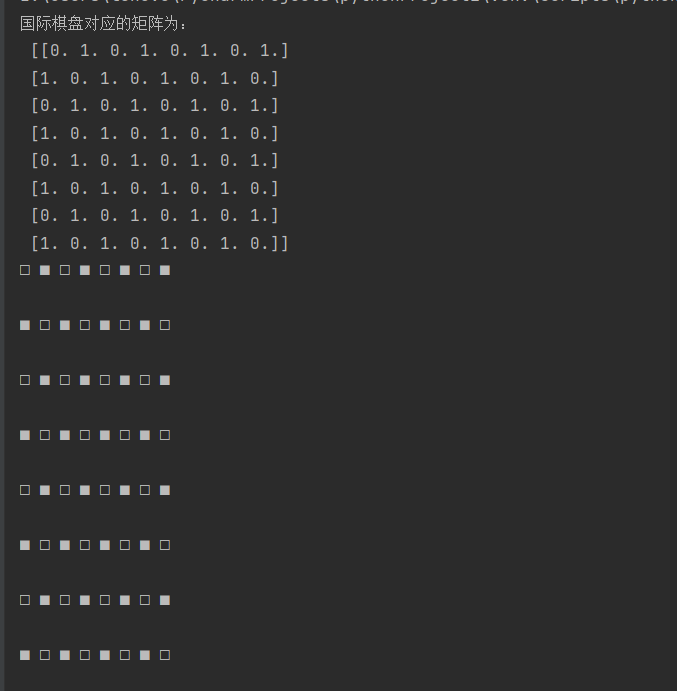 1 import numpy as np 2 matr1=np.ones((8,8)) 3 for i in range(8): 4 for j in range(8): 5 if(i+j)%2==0: 6 matr1[i,j]=0 7 print('国际棋盘对应的矩阵为:\n',matr1) 8 9 for i in range(0,8): 10 for j in range(0,8): 11 if matr1[i,j]==0: 12 print("□",end=' ') 13 else: 14 print("■", end=' ') 15 print('\n')
