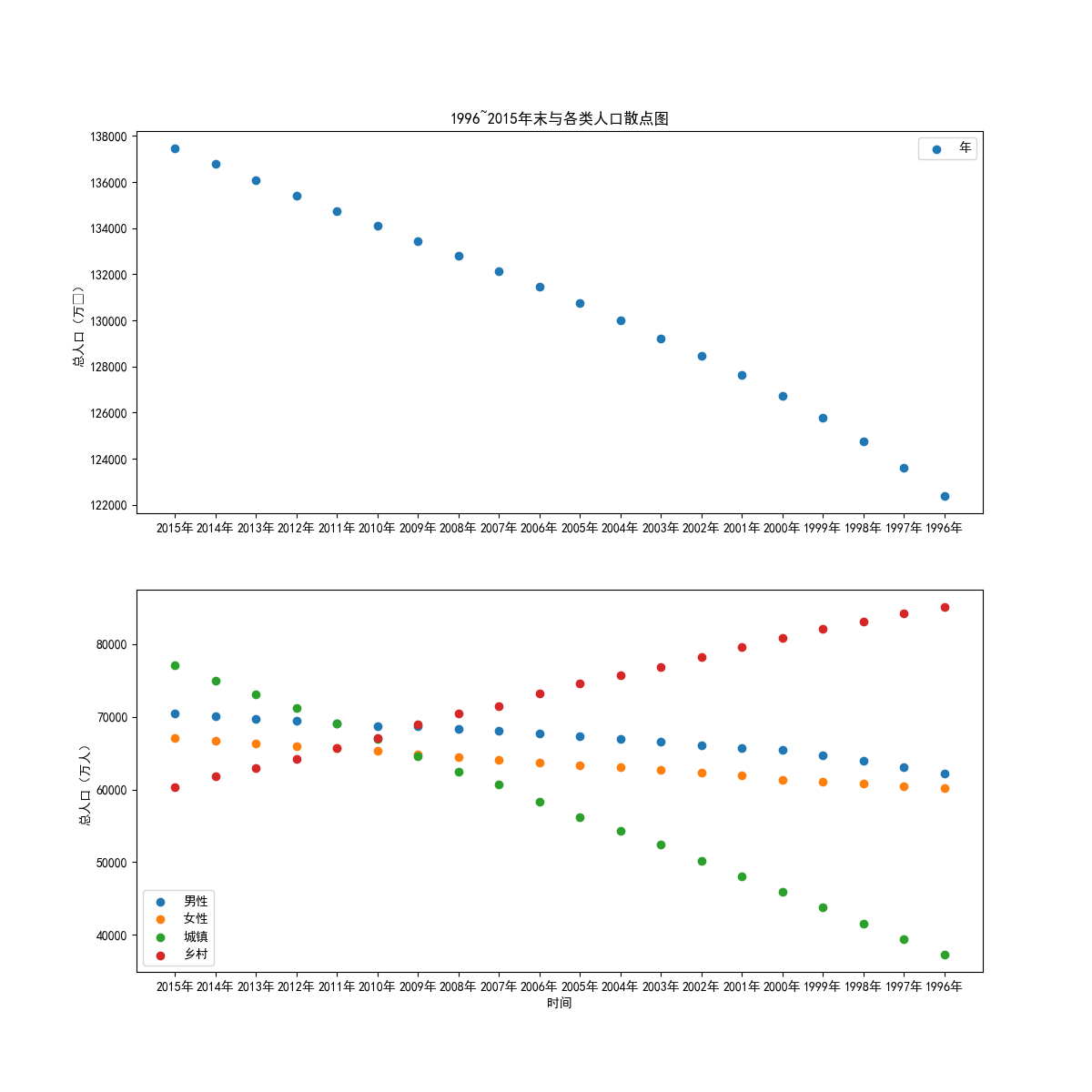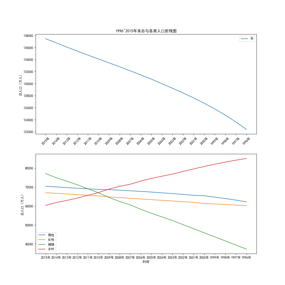 1 #导入模块 2 import numpy as np 3 import matplotlib.pyplot as plt 4 5 #使⽤numpy库读取⼈⼝数据 6 data=np.load("D:/Users/lenovo/Desktop/期中/populations.npz",allow_pickle=True)#读取文件,返回输入数组 7 print(data.files)#查看⽂件中的数组 8 print(data['data']) 9 print(data['feature_names']) 10 plt.rcParams['font.sans-serif'] = 'SimHei' # 设置中文显示 11 plt.rcParams['axes.unicode_minus'] = False# 防止字符无法显示 12 name=data['feature_names']#提取其中的feature_names数组,视为数据的标签 13 values=data['data']#提取其中的data数组,视为数据的存在位置 14 15 #设置画布 16 p1=plt.figure(figsize=(12,12))#确定画布⼤⼩ 17 pip1=p1.add_subplot(2,1,1)#创建⼀个两⾏⼀列的⼦图并开始绘制 18 19 #在⼦图上绘制散点图 20 plt.scatter(values[0:20,0],values[0:20,1])#,marker='8',color='red' 21 plt.ylabel('总人口(万⼈)') 22 plt.legend('年末') 23 plt.title('1996~2015年末与各类人口散点图') 24 pip2=p1.add_subplot(2,1,2)#绘制⼦图2 25 plt.scatter(values[0:20,0],values[0:20,2])#,marker='o',color='yellow' 26 plt.scatter(values[0:20,0],values[0:20,3])#,marker='D',color='green' 27 plt.scatter(values[0:20,0],values[0:20,4])#,marker='p',color='blue' 28 plt.scatter(values[0:20,0],values[0:20,5])#,marker='s',color='purple' 29 plt.xlabel('时间') 30 plt.ylabel('总人口(万人)') 31 plt.xticks(values[0:20,0]) 32 plt.legend(['男性','女性','城镇','乡村']) 33 #在⼦图上绘制折线图 34 p2=plt.figure(figsize=(12,12)) 35 p1=p2.add_subplot(2,1,1) 36 plt.plot(values[0:20,0],values[0:20,1])#,linestyle = '-',color='r',marker='8' 37 plt.ylabel('总人口(万人)') 38 plt.xticks(range(0,20,1),values[range(0,20,1),0],rotation=45)#rotation设置倾斜度 39 plt.legend('年末') 40 plt.title('1996~2015年末总与各类人口折线图') 41 p2=p2.add_subplot(2,1,2) 42 plt.plot(values[0:20,0],values[0:20,2])#,'y-' 43 plt.plot(values[0:20,0],values[0:20,3])#,'g-.' 44 plt.plot(values[0:20,0],values[0:20,4])#,'b-' 45 plt.plot(values[0:20,0],values[0:20,5])#,'p-' 46 plt.xlabel('时间') 47 plt.ylabel('总人口(万人)') 48 plt.xticks(values[0:20,0]) 49 plt.legend(['男性','女性','城镇','乡村']) 50 #显⽰图⽚ 51 plt.show()