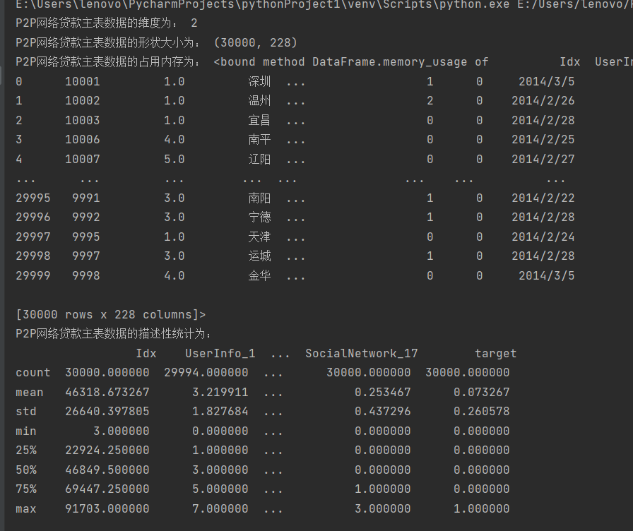 1 #导入模块 2 import os 3 import pandas as pd 4 5 master = pd.read_csv('D:/Users/lenovo/Desktop/期中/Training_Master.csv',encoding='gbk')#读取csv文件 6 print('P2P网络贷款主表数据的维度为:',master.ndim) 7 print('P2P网络贷款主表数据的形状大小为:',master.shape) 8 print('P2P网络贷款主表数据的占用内存为:',master.memory_usage) 9 #代码16-2 10 print('P2P网络贷款主表数据的描述性统计为:\n',master.describe())