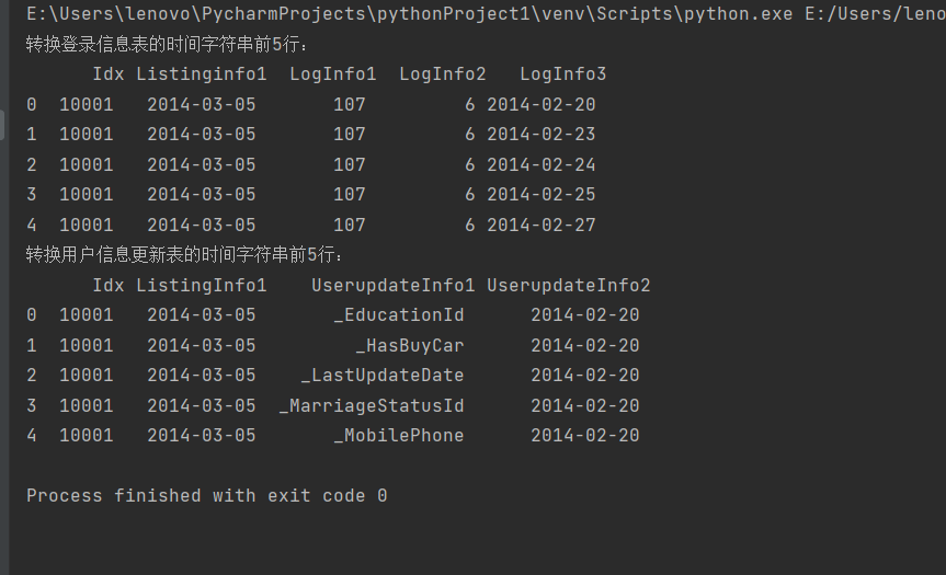 1 import pandas as pd 2 #读取文件 3 LogInfo = pd.read_csv('D:/Users/lenovo/Desktop/期中/Training_LogInfo.csv',encoding='gbk') 4 Userupdate = pd.read_csv('D:/Users/lenovo/Desktop/期中/Training_Userupdate.csv',encoding='gbk') 5 # 转换时间字符串 6 LogInfo['Listinginfo1']=pd.to_datetime(LogInfo['Listinginfo1']) 7 LogInfo['LogInfo3']=pd.to_datetime(LogInfo['LogInfo3']) 8 print('转换登录信息表的时间字符串前5行:\n',LogInfo.head()) 9 Userupdate['ListingInfo1']=pd.to_datetime(Userupdate['ListingInfo1']) 10 Userupdate['UserupdateInfo2']=pd.to_datetime(Userupdate['UserupdateInfo2']) 11 print('转换用户信息更新表的时间字符串前5行:\n',Userupdate.head())