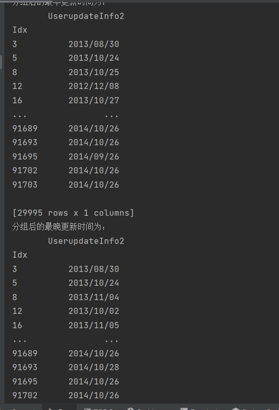 1 import pandas as pd 2 import numpy as np 3 LogInfo = pd.read_csv('D:/Users/lenovo/Desktop/期中/Training_LogInfo.csv',encoding='gbk') 4 Userupdate = pd.read_csv('D:/Users/lenovo/Desktop/期中/Training_Userupdate.csv',encoding='gbk') 5 # 使用groupby方法对用户信息更新表和登录信息表进行分组 6 LogGroup = LogInfo[['Idx','LogInfo3']].groupby(by = 'Idx') 7 UserGroup = Userupdate[['Idx','UserupdateInfo2']].groupby(by = 'Idx') 8 9 # 使用agg方法求取分组后的最早,最晚,更新登录时间 10 print('分组后的最早登录时间为:\n',LogGroup.agg(np.min)) 11 print('分组后的最晚登录时间为:\n',LogGroup.agg(np.max)) 12 print('分组后的最早更新时间为:\n',UserGroup.agg(np.min)) 13 print('分组后的最晚更新时间为:\n',UserGroup.agg(np.max)) 14 15 # 使用size方法求取分组后的数据的信息更新次数与登录次数 16 print('分组后的数据的信息更新次数为:\n',LogGroup.size()) 17 print('分组后的数据的登录次数为:\n',UserGroup.size())