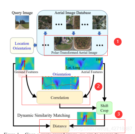 如上图所示,整个方法的流程主要分为3个部分。首先看第①部分,本论文利用Polar Transform将aerial images全部转为ground images。然后,本论文使用vgg16作为backbone提取feature maps,这里不像以前的方法把图像变成一个向量的representation,而是最后输出一对feature volume。这样做的目的就是为后续进行圆周卷积提取orientation做准备。