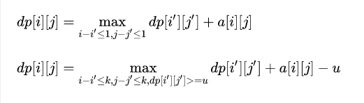 题意:给你一个n * m的矩阵,你要从(1, 1)点走到(n, m)点,由于矩阵着火,你每次只能往右,往下,往右下其中一个方向走1步,矩阵每个点有a[i][j]那么多的空气,如果a[i][j]<=0,则该点充满烟雾你在该点不能呼吸,每次呼吸你可以吸入任意数量的空气并存下来,在经过烟雾点时,你必须憋气,每次憋气花费U的气体走最多K步,问你是否可以走到点(n, m),如果可以输出最终肺内最多能剩余多少气体,如果不能输出-1