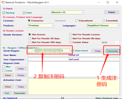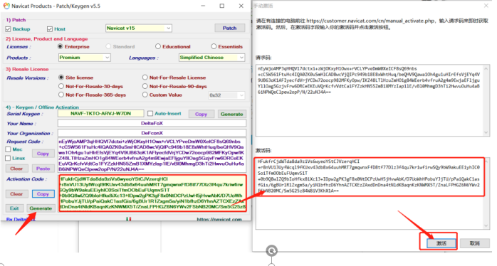 14、点击左下角的生成按钮(按钮别点错了)生成注册码,然后将生成的注册码(黄色部分)复制到【激活码】里去,点击【激活】按钮。下图示: