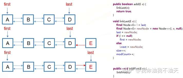 LinkedList基于链表来实现集合的功能,其实现了静态类Node,集合中的每个对象都由一个Node保存,每个Node都拥有到自己的前一个和后一个Node的引用