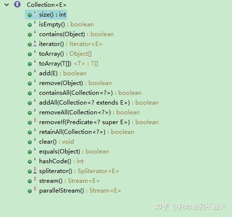 Collection接口定义了一个包含一批对象的集合。接口的主要方法包括:
