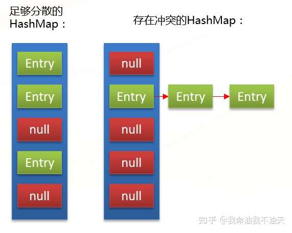 如果两个不同的key计算出的index是一样的,就会发生两个不同的key都对应到数组中同一个位置的情况,也就是所谓的哈希冲突。HashMap处理哈 希冲突的方法是拉链法,也就是说数组中每个位置保存的实际是一个Entry链表,链表中每个Entry都拥有指向链表中后一个Entry的引用。在发生哈希冲突时,将冲突的Entry追加至链表的头部。当HashMap在寻址时发现某个key对应的数组index上有多个Entry,便会遍历该位置上的 Entry链表,直到找到目标的Entry。