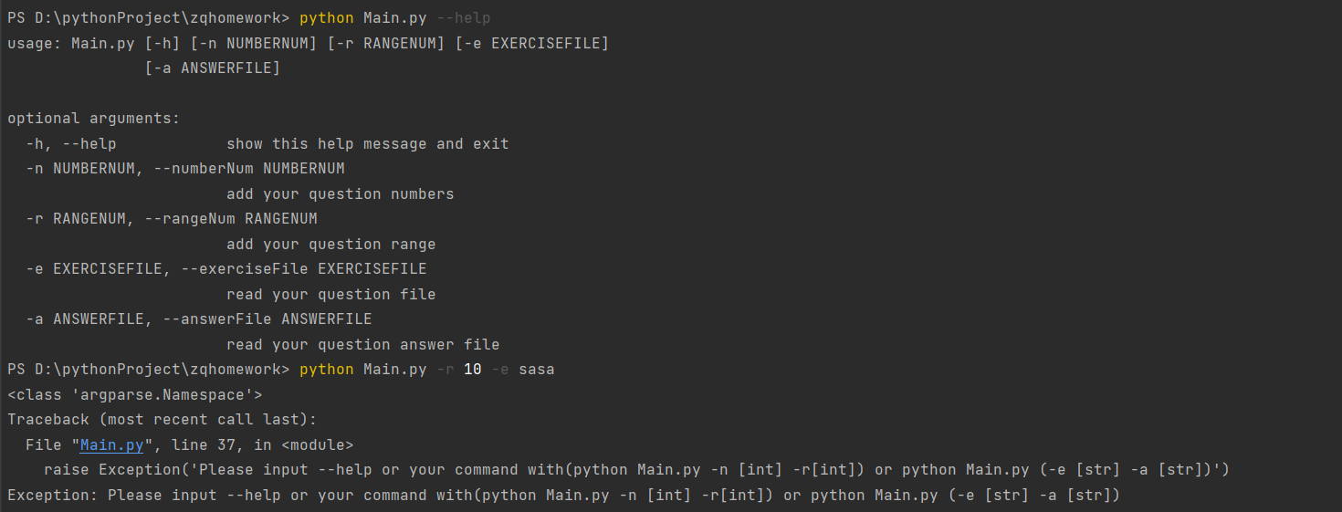 raise Exception('Please input --help or your command with(python Main.py -n [int] -r[int]) or python Main.py (-e [str] -a [str])')
