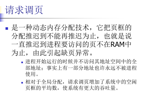 处于用户态的进程,当申请内存时,只会打一张欠条,当开始使用这块内存时,产生缺页异常,cpu给其分配地址空间。