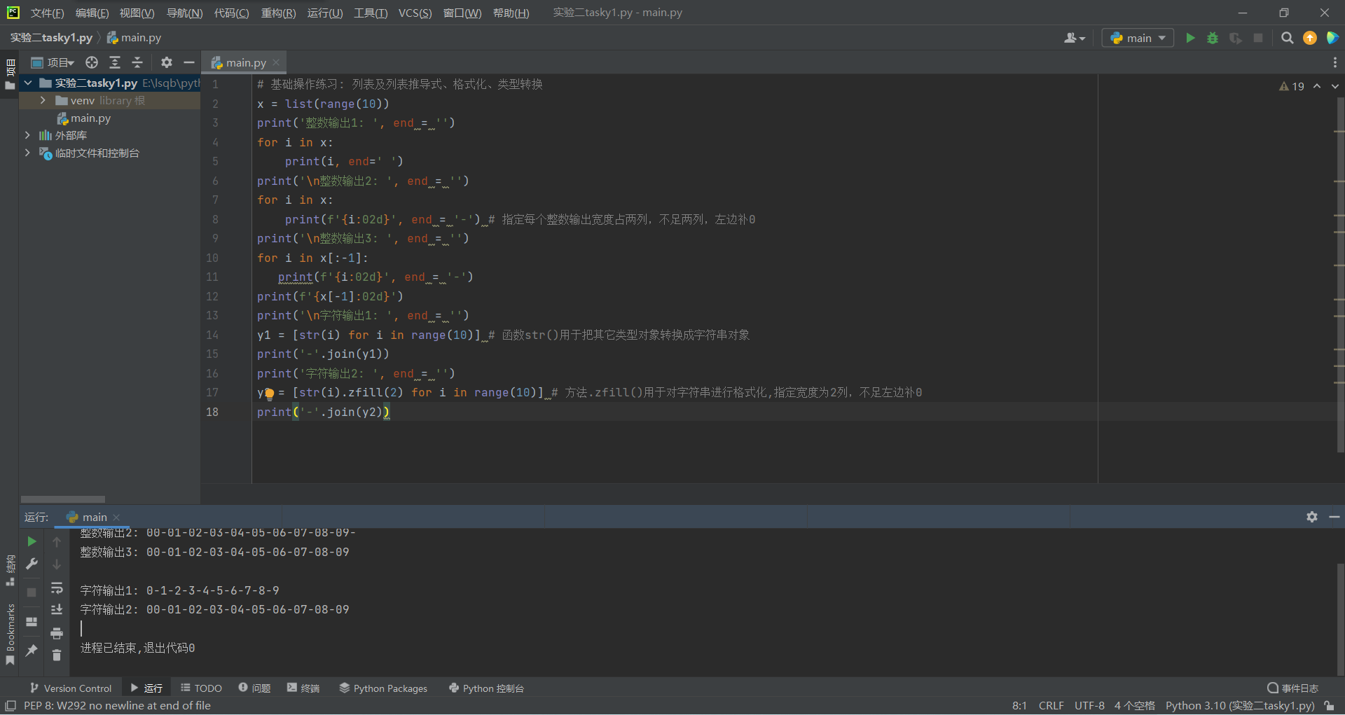 1 1 # 基础操作练习: 列表及列表推导式、格式化、类型转换 2 2 x = list(range(10)) 3 3 print('整数输出1: ', end = '') 4 4 for i in x: 5 5 print(i, end=' ') 6 6 print('\n整数输出2: ', end = '') 7 7 for i in x: 8 8 print(f'{i:02d}', end = '-') # 指定每个整数输出宽度占两列,不足两列,左边补0 9 9 print('\n整数输出3: ', end = '') 10 10 for i in x[:-1]: 11 11 print(f'{i:02d}', end = '-') 12 12 print(f'{x[-1]:02d}') 13 13 print('\n字符输出1: ', end = '') 14 14 y1 = [str(i) for i in range(10)] # 函数str()用于把其它类型对象转换成字符串对象 15 15 print('-'.join(y1)) 16 16 print('字符输出2: ', end = '') 17 17 y2 = [str(i).zfill(2) for i in range(10)] # 方法.zfill()用于对字符串进行格式化,指定宽度为2列,不足左边补0 18 18 print('-'.join(y2))