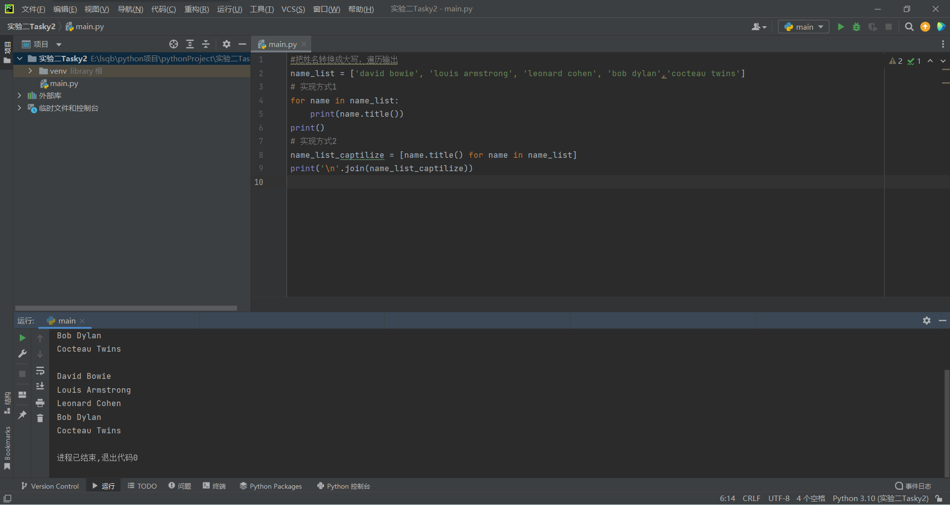 1 #把姓名转换成大写,遍历输出 2 name_list = ['david bowie', 'louis armstrong', 'leonard cohen', 'bob dylan','cocteau twins'] 3 # 实现方式1 4 for name in name_list: 5 print(name.title()) 6 print() 7 # 实现方式2 8 name_list_captilize = [name.title() for name in name_list] 9 print('\n'.join(name_list_captilize))