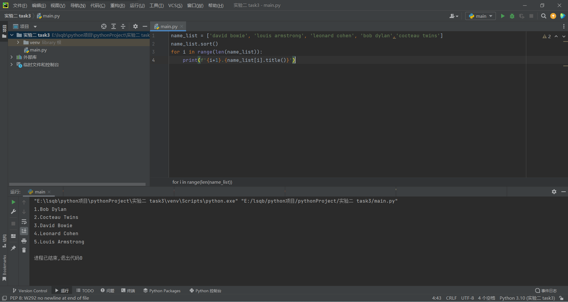 1 name_list = ['david bowie', 'louis armstrong', 'leonard cohen', 'bob dylan','cocteau twins'] 2 name_list.sort() 3 for i in range(len(name_list)): 4 print(f'{i+1}.{name_list[i].title()}')