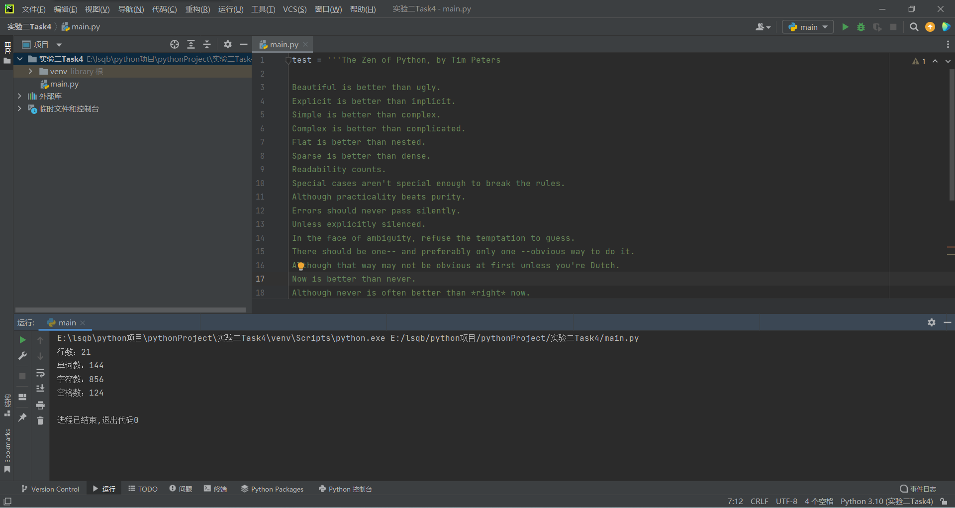 1 test = '''The Zen of Python, by Tim Peters 2 3 Beautiful is better than ugly. 4 Explicit is better than implicit. 5 Simple is better than complex. 6 Complex is better than complicated. 7 Flat is better than nested. 8 Sparse is better than dense. 9 Readability counts. 10 Special cases aren't special enough to break the rules. 11 Although practicality beats purity. 12 Errors should never pass silently. 13 Unless explicitly silenced. 14 In the face of ambiguity, refuse the temptation to guess. 15 There should be one-- and preferably only one --obvious way to do it. 16 Although that way may not be obvious at first unless you're Dutch. 17 Now is better than never. 18 Although never is often better than *right* now. 19 If the implementation is hard to explain, it's a bad idea. 20 If the implementation is easy to explain, it may be a good idea. 21 Namespaces are one honking great idea -- let's do more of those!''' 22 23 print(f'行数:{len(test.splitlines())}') 24 print(f'单词数:{len(test.split())}') 25 print(f'字符数:{len(test)}') 26 print(f"空格数:{test.count(' ')}")
