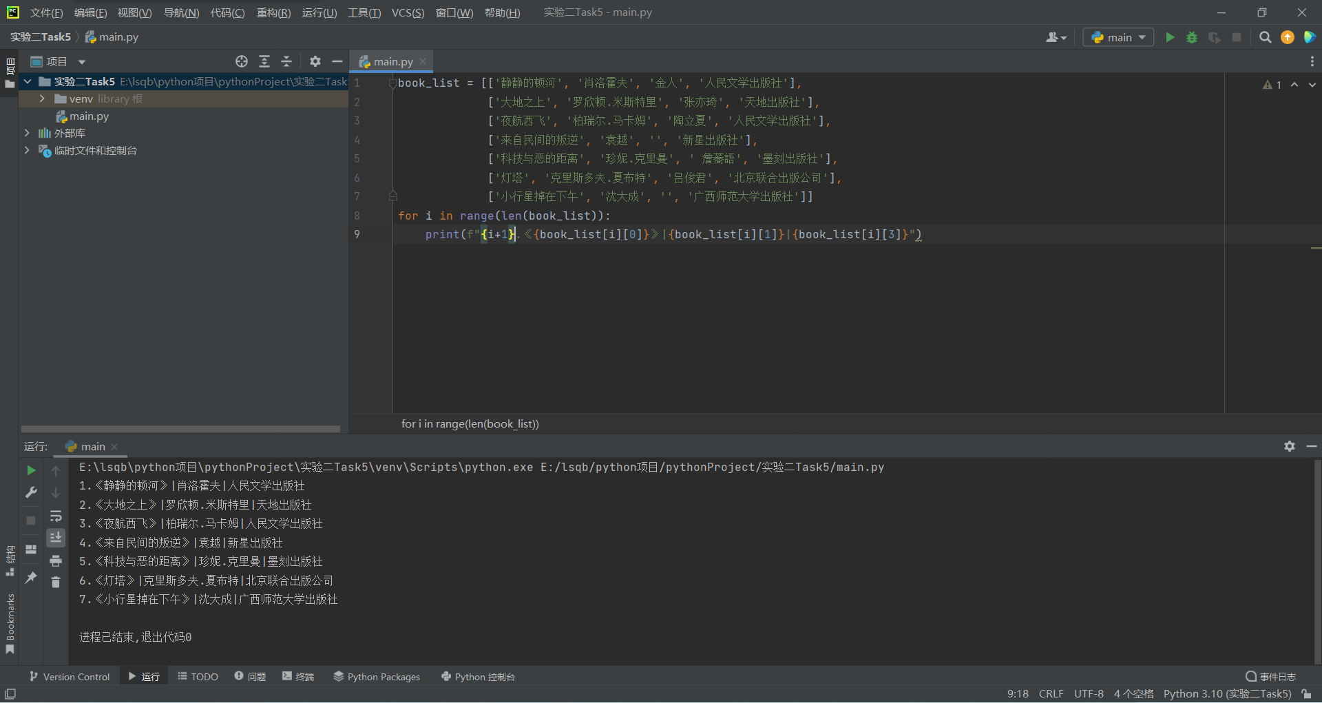 1 book_list = [['静静的顿河', '肖洛霍夫', '金人', '人民文学出版社'], 2 ['大地之上', '罗欣顿.米斯特里', '张亦琦', '天地出版社'], 3 ['夜航西飞', '柏瑞尔.马卡姆', '陶立夏', '人民文学出版社'], 4 ['来自民间的叛逆', '袁越', '', '新星出版社'], 5 ['科技与恶的距离', '珍妮.克里曼', ' 詹蕎語', '墨刻出版社'], 6 ['灯塔', '克里斯多夫.夏布特', '吕俊君', '北京联合出版公司'], 7 ['小行星掉在下午', '沈大成', '', '广西师范大学出版社']] 8 for i in range(len(book_list)): 9 print(f"{i+1}.《{book_list[i][0]}》|{book_list[i][1]}|{book_list[i][3]}")