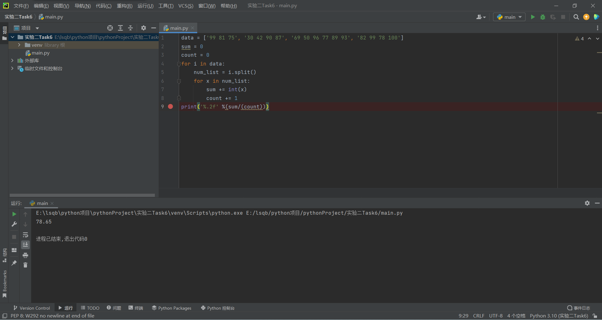 1 data = ['99 81 75', '30 42 90 87', '69 50 96 77 89 93', '82 99 78 100'] 2 sum = 0 3 count = 0 4 for i in data: 5 num_list = i.split() 6 for x in num_list: 7 sum += int(x) 8 count += 1 9 print('%.2f' %(sum/(count)))