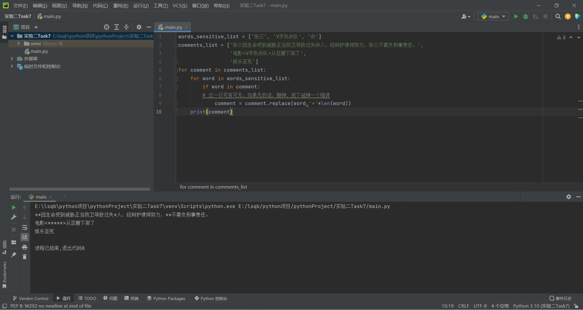 1 words_sensitive_list = ['张三', 'V字仇杀队', '杀'] 2 comments_list = ['张三因生命受到威胁正当防卫导致过失杀人,经辩护律师努力,张三不需负刑事责任。', 3 '电影<V字仇杀队>从豆瓣下架了', 4 '娱乐至死'] 5 for comment in comments_list: 6 for word in words_sensitive_list: 7 if word in comment: 8 # 这一行可有可无。如果无的话,删掉,底下减掉一个缩进 9 comment = comment.replace(word,'*'*len(word)) 10 print(comment)