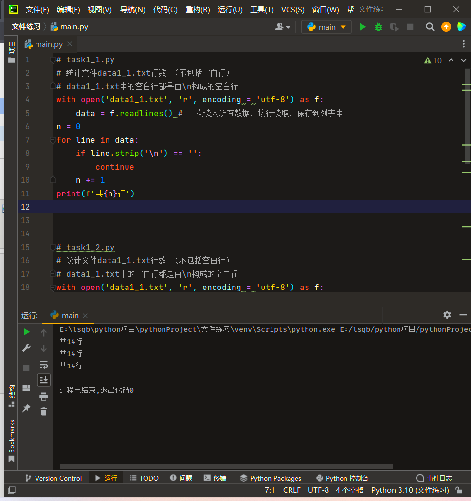 1 # task1_1.py 2 # 统计文件data1_1.txt行数 (不包括空白行) 3 # data1_1.txt中的空白行都是由\n构成的空白行 4 with open('data1_1.txt', 'r', encoding = 'utf-8') as f: 5 data = f.readlines() # 一次读入所有数据,按行读取,保存到列表中 6 n = 0 7 for line in data: 8 if line.strip('\n') == '': 9 continue 10 n += 1 11 print(f'共{n}行')