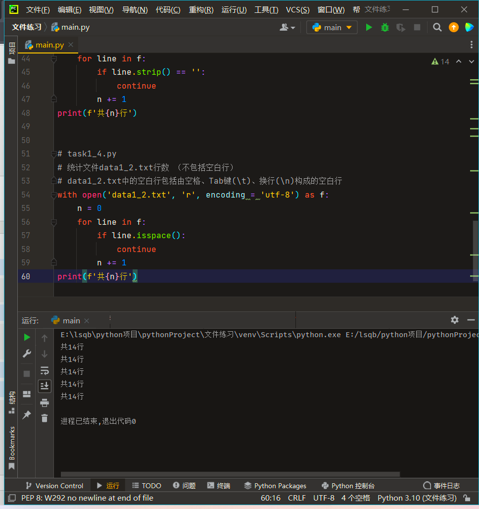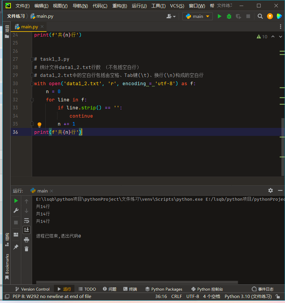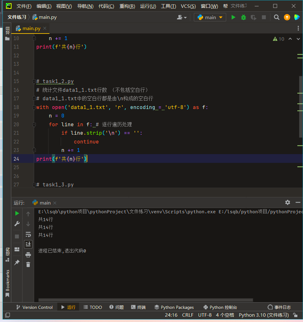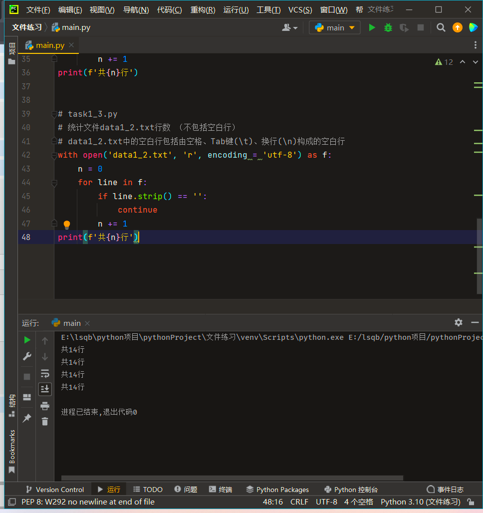 1 # task1_3.py 2 # 统计文件data1_2.txt行数 (不包括空白行) 3 # data1_2.txt中的空白行包括由空格、Tab键(\t)、换行(\n)构成的空白行 4 with open('data1_2.txt', 'r', encoding = 'utf-8') as f: 5 n = 0 6 for line in f: 7 if line.strip() == '': 8 continue 9 n += 1 10 print(f'共{n}行')