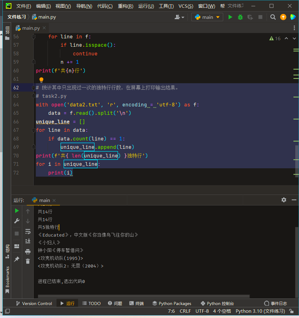 1 # 统计其中只出现过一次的独特行行数,在屏幕上打印输出结果。 2 # task2.py 3 with open('data2.txt', 'r', encoding = 'utf-8') as f: 4 data = f.read().split('\n') 5 unique_line = [] 6 for line in data: 7 if data.count(line) == 1: 8 unique_line.append(line) 9 print(f'共{ len(unique_line) }独特行') 10 for i in unique_line: 11 print(i)
