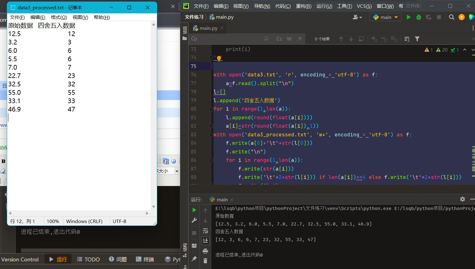 1 with open('data3.txt', 'r', encoding = 'utf-8') as f: 2 a=f.read().split("\n") 3 l=[] 4 l.append('四舍五入数据') 5 for i in range(1,len(a)): 6 l.append(round(float(a[i]))) 7 a[i]=str(round(float(a[i]),1)) 8 with open('data3_processed.txt', 'w+', encoding = 'utf-8') as f: 9 f.write(a[0]+'\t'+str(l[0])) 10 f.write("\n") 11 for i in range(1,len(a)): 12 f.write(str(a[i])) 13 f.write('\t'*2+str(l[i])) if len(a[i])>=4 else f.write('\t'*2+str(l[i])) 14 f.write('\n') 15 for i in range(1,len(a)): 16 a[i]=float(a[i]) 17 print(a[0],'\n'+str(a[1:])) 18 print(l[0],'\n'+str(l[1:]))