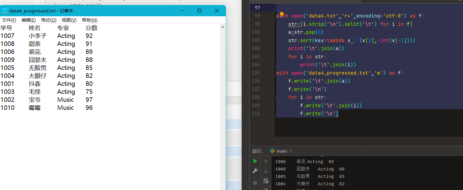 1 with open('data4.txt','r+',encoding='utf-8') as f: 2 str=[i.strip('\n').split('\t') for i in f] 3 a=str.pop(0) 4 str.sort(key=lambda x : (x[2],-int(x[-1]))) 5 print('\t'.join(a)) 6 for i in str: 7 print('\t'.join(i)) 8 with open('data4_progressed.txt','w') as f: 9 f.write('\t'.join(a)) 10 f.write('\n') 11 for i in str: 12 f.write('\t'.join(i)) 13 f.write('\n')