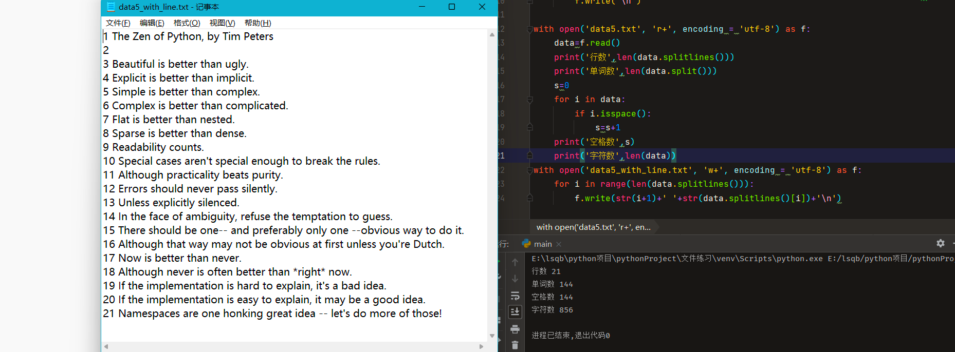 1 with open('data5.txt', 'r+', encoding = 'utf-8') as f: 2 data=f.read() 3 print('行数',len(data.splitlines())) 4 print('单词数',len(data.split())) 5 s=0 6 for i in data: 7 if i.isspace(): 8 s=s+1 9 print('空格数',s) 10 print('字符数',len(data)) 11 with open('data5_with_line.txt', 'w+', encoding = 'utf-8') as f: 12 for i in range(len(data.splitlines())): 13 f.write(str(i+1)+' '+str(data.splitlines()[i])+'\n')