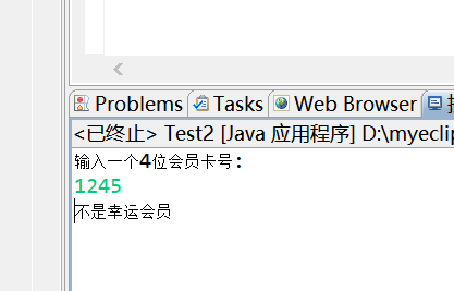 package homework2; import java.util.Random; import java.util.Scanner; public class Test2 { /** * @param args */ public static void main(String[] args) { // TODO Auto-generated method stub Random r=new Random(); Scanner input=new Scanner(System.in); System.out.println("输入一个4位会员卡号:"); int x=input.nextInt(); int a=r.nextInt(10); if(a==x/100%10){ System.out.println("是幸运会员"); } else{ System.out.println("不是幸运会员"); } } }