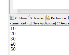 package ktlx; public class lx1 { /** * @param args */ public static void main(String[] args) { // TODO Auto-generated method stub int []a={10,20,30,40,50}; for(int i=0;i<a.length;i++){ System.out.println(a[i]); } } }