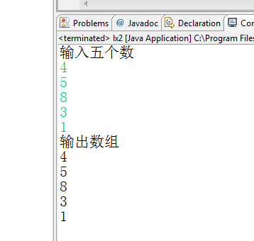 package ktlx; import java.util.Scanner; public class lx2 { /** * @param args */ public static void main(String[] args) { // TODO Auto-generated method stub Scanner input=new Scanner(System.in); int []a=new int[5]; System.out.println("输入五个数"); for(int i=0;i<a.length;i++){ a[i]=input.nextInt(); } System.out.println("输出数组"); for(int i=0;i<a.length;i++){ System.out.println(a[i]); } } }