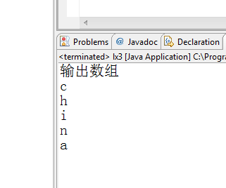 package ktlx; public class lx3 { /** * @param args */ public static void main(String[] args) { // TODO Auto-generated method stub char []a={'c','h','i','n','a'}; System.out.println("输出数组"); for(int i=0;i<a.length;i++){ System.out.println(a[i]); } } }