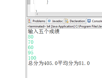 package ktlx; import java.util.Scanner; public class lx4 { /** * @param args */ public static void main(String[] args) { // TODO Auto-generated method stub Scanner input=new Scanner(System.in); double []a=new double[5]; System.out.println("输入五个成绩"); for(int i=0;i<a.length;i++){ a[i]=input.nextDouble(); } double s=0,b; for(int i=0;i<a.length;i++){ s=s+a[i]; } b=s/5; System.out.println("总分为"+s+"平均分为"+b); } }