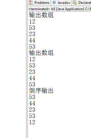 package ktlx; public class lx5 { /** * @param args */ public static void main(String[] args) { // TODO Auto-generated method stub int []a={12,53,23,44,53}; System.out.println("输出数组"); for(int i=0;i<a.length;i++){ System.out.println(a[i]); } System.out.println("输出数组"); for(int i:a){ System.out.println(i); } System.out.println("倒序输出"); for(int i=4;i>=0;i--){ System.out.println(a[i]); } } }