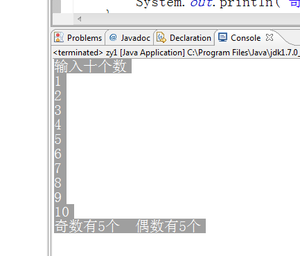 package ktlx; import java.util.Scanner; public class zy1 { /** * @param args */ public static void main(String[] args) { // TODO Auto-generated method stub Scanner input=new Scanner(System.in); int []a=new int[10]; System.out.println("输入十个数"); for(int i=0;i<a.length;i++){ a[i]=input.nextInt(); } int b=0; for(int i=0;i<10;i++){ if(a[i]%2==0){ b=b+1; } } System.out.println("奇数有"+(10-b)+"个"+" "+"偶数有"+b+"个"); } }