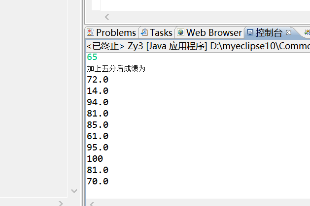 package ktlx; import java.util.Scanner; public class zy3 { /** * @param args */ public static void main(String[] args) { // TODO Auto-generated method stub Scanner input = new Scanner(System.in); double[] grade = new double[10]; System.out.println("输入十个成绩"); for (int i = 0; i < grade.length; i++) { grade[i] = input.nextDouble(); } System.out.println("加上五分后成绩为"); for (int i = 0; i < grade.length; i++) { if (grade[i] + 5 >= 100) { System.out.println(100); } else { System.out.println(grade[i] + 5); } } } }