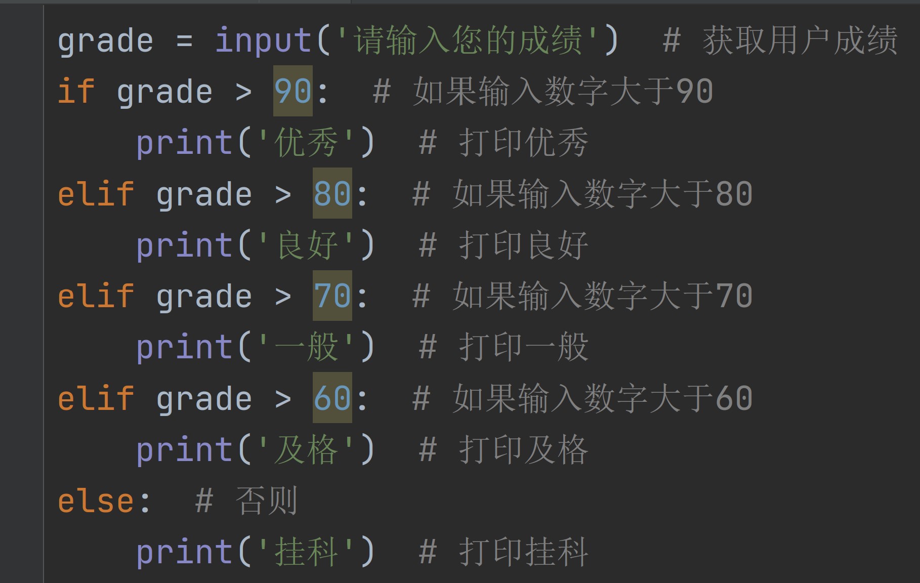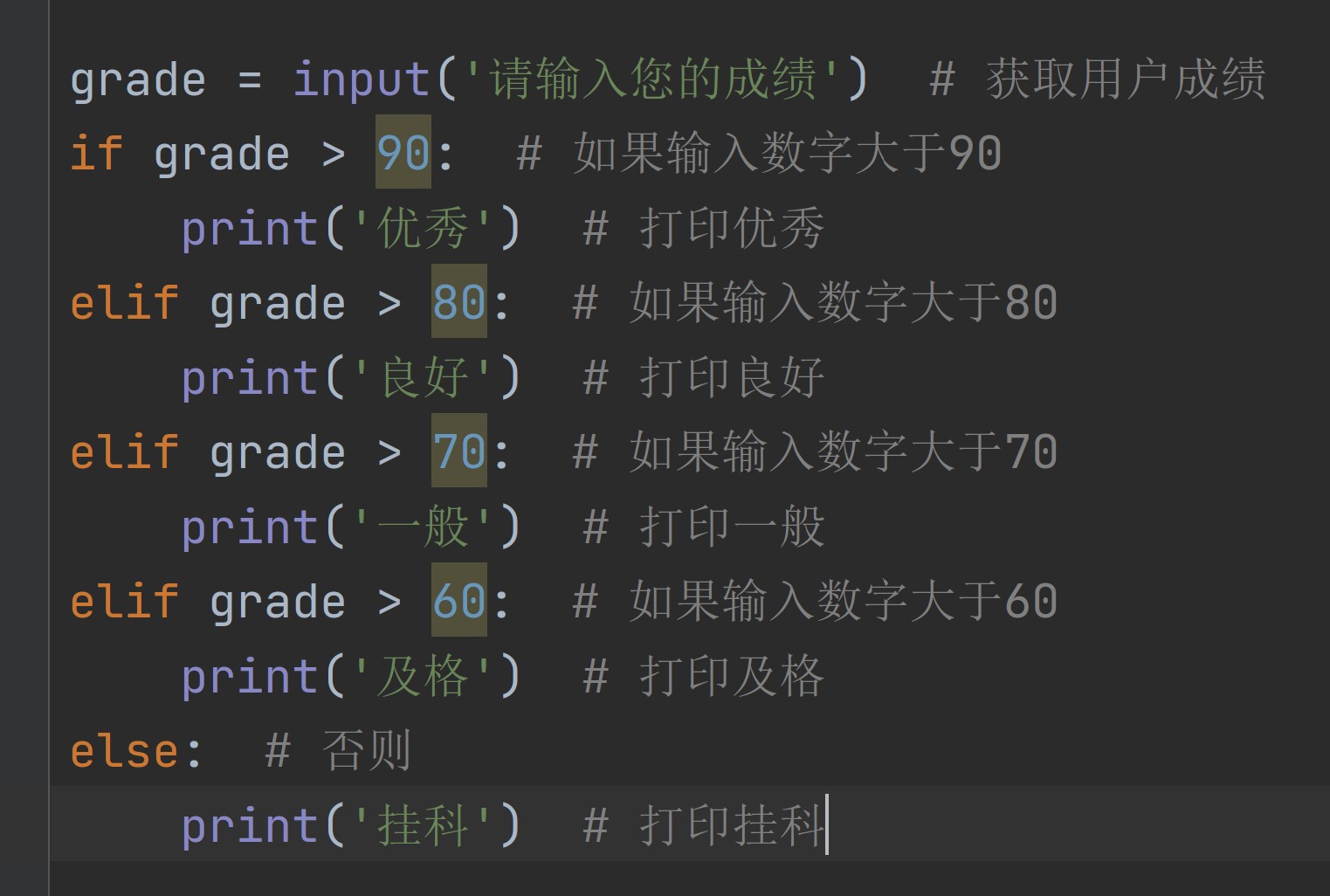 如果成绩大于90 则打印优秀