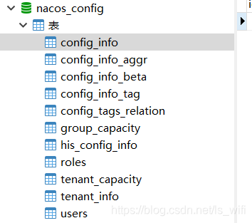 3.在你的云数据库中执行naocs/conf/下的nacos-mysql.sql脚本,我是用docker创建的mysql8版本的数据库容器(用你的navicat或者sqlyog连上你的云数据库,执行脚本和增删改查数据库会更方便),执行完会结果如下,数据库需要你自己去创建