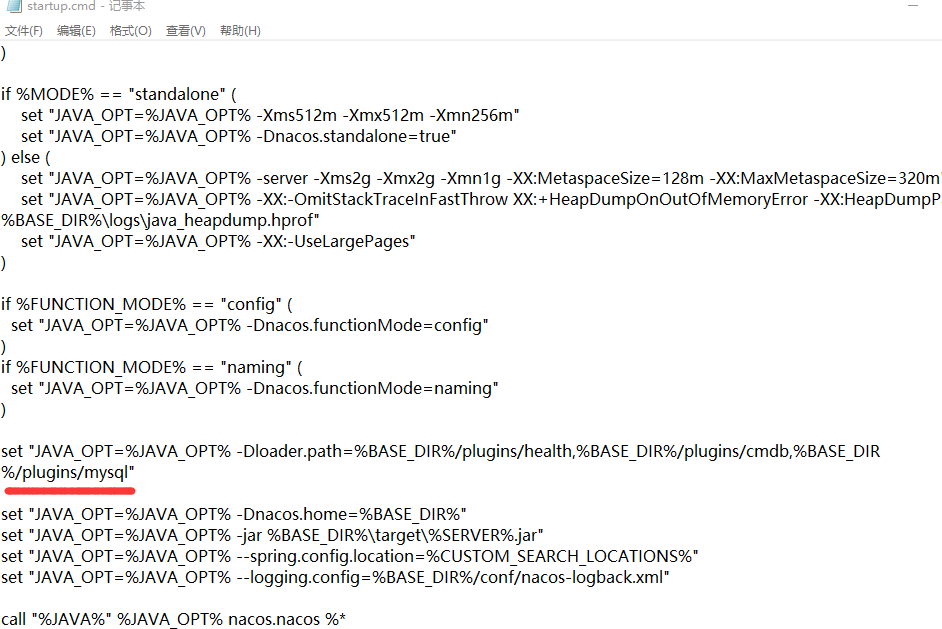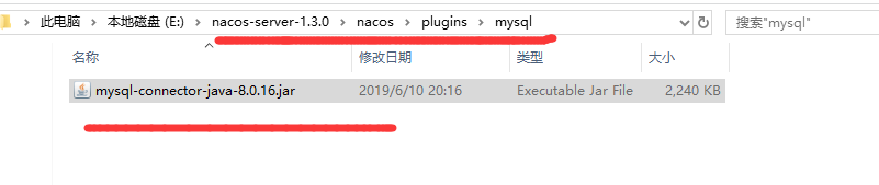 2.在你nacos的安装目录新建plugins/mysql文件夹(因为startup.cmd里面默认加载这个目录下的jar包),加入一个8.0+版本的mysql-connector-java...jar